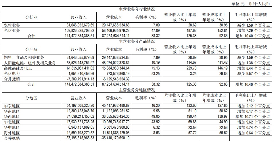 具体来看, 报告期内,通威股份农牧业务实现营业收入316.46亿元,同比增长28.69%,毛利率为7.89%,同比减少1.59%;光伏业务实现营业收入1098.26亿元,同比增长187.62%,毛利率为47.09%,同比增长7.29%。