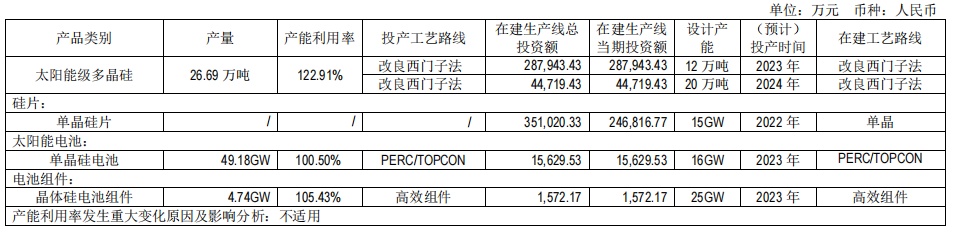截至报告期末,通威股份已形成超26万吨高纯晶硅产能、超49GW单晶硅电池产能以及4GW晶体硅电池组件产能。对于光伏业务在2023年经营计划,通威股份表示,力争实现高纯晶硅业务出货30万吨,太阳能电池业务出货70GW(含自用),组件业务出货35GW;光伏发电业务新增投资建设“渔光一体”项目1GW。