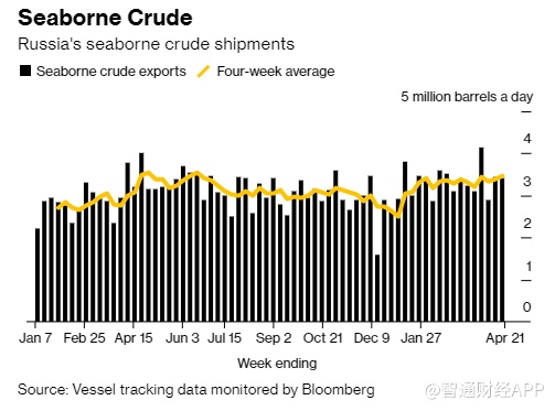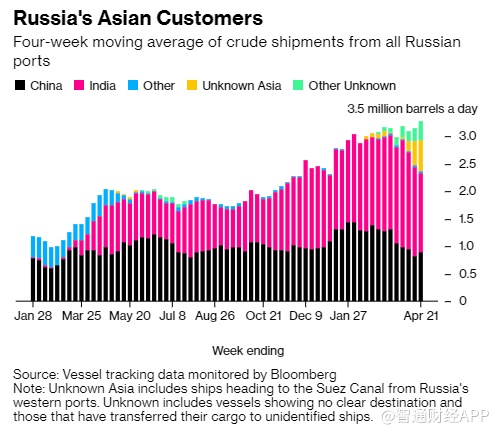 截至4月21日,俄罗斯发往亚洲的四周平均出口量,加上没有最终目的地的船只出口量,升至328万桶/日的历史最高水平。这比截至3月31日的前一个高点高出10万桶/日。