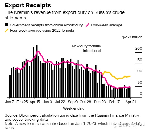 从原油出口关税中流入克里姆林宫的资金略有下降,在截至4月21日的一周内减少了50万美元,至4,600万美元,而四周的平均收入增加了100万美元,至4,700万美元。