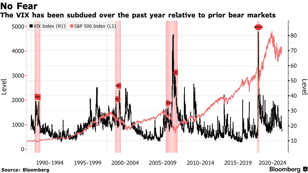Kolanovic周一在给客户的一份报告中表示,芝加哥期权交易所波动率指数(VIX)的下跌本质上是技术性的,而不是对股市面临风险的准确反映。VIX指数在上周跌至16点后,周一维持在17点附近,这是自2021年底以来的最低水平。