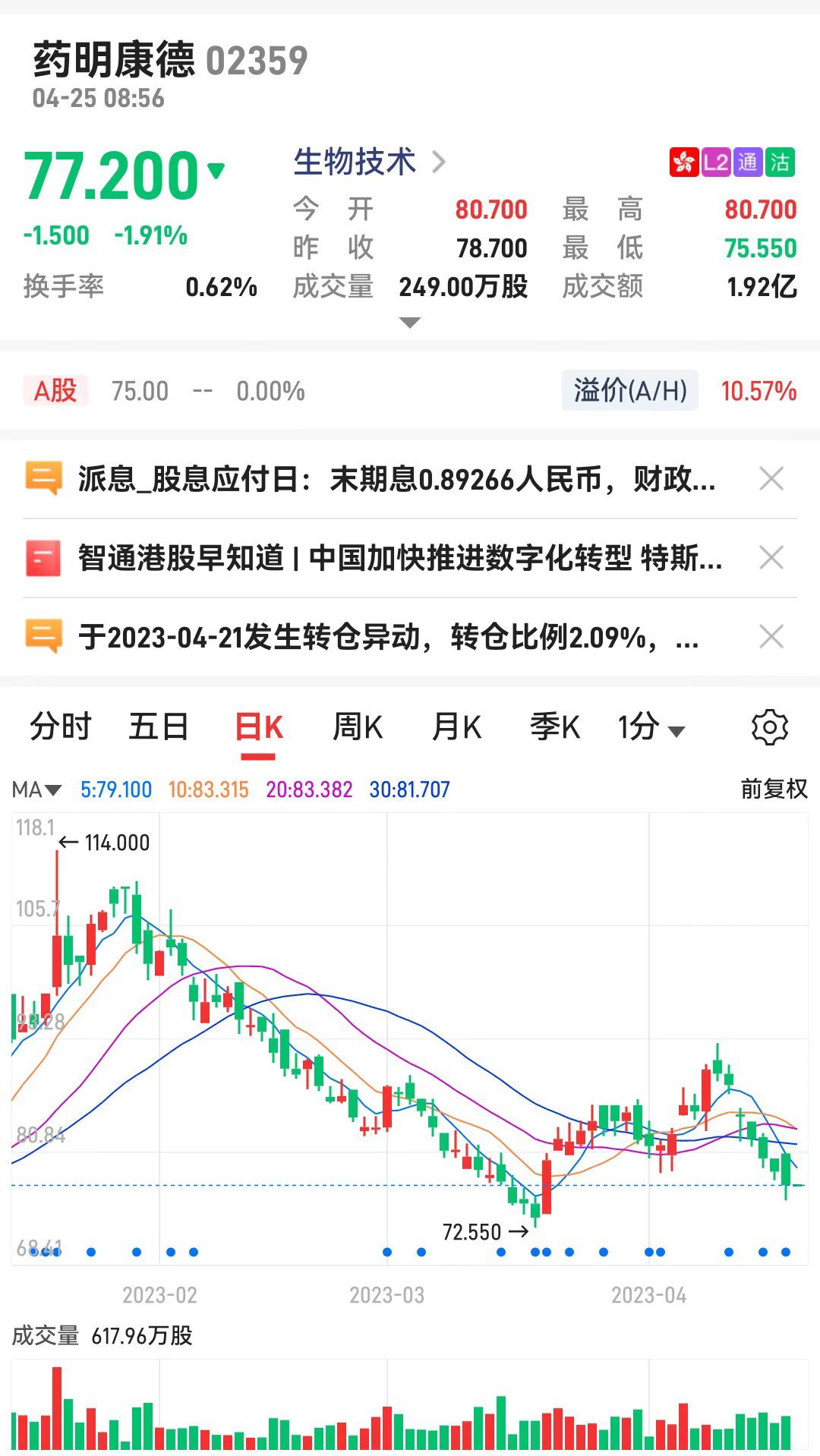 从二级市场来看,药明康德自今年1月16日创下114港元/股的阶段高点以来,阴跌不止,截止4月24日收盘,股价累计跌幅已超30%。