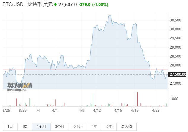 比特币周一几乎没有变化,早些时候下跌1.9%,至26989美元。这是自3月28日以来,比特币价格首次跌破2.7万美元。其他数字资产大多持平或上涨,以太坊变化不大,Avalanche上涨约2%。