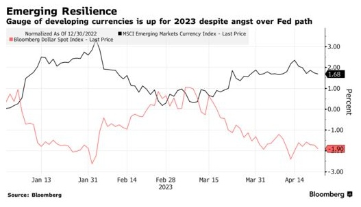 他们写道,虽然发达经济体需要在更长时间内保持高利率以抑制粘性通胀,但新兴市场的韧性更强。他们表示,在美联储加息接近尾声之际,一项衡量发展中国家货币的关键指数仍在上升,这表明,国内政策制定者将能够偏离美国,并避免本币贬值。