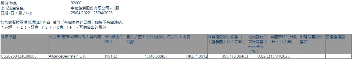 智通财经APP获悉,香港联交所最新资料显示,4月19日,AllianceBernstein L.P.增持中国铝业(02600)134万股,每股作价4.8512港元,总金额约为650.06万港元。增持后最新持股数目约为3.56亿股,最新持股比例为9.02%。