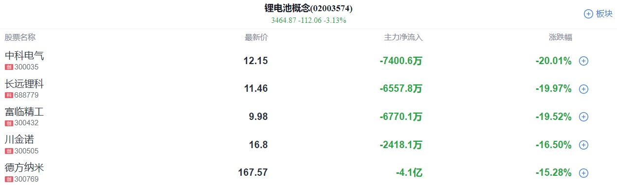锂电池板块多股一季报亏损或同比大幅下降超九成,中科电气、长远锂科20%跌停,蔚蓝锂芯、胜华新材、江特电机等跌停,赣锋锂业、富临精工、天力锂能等大幅跟跌。