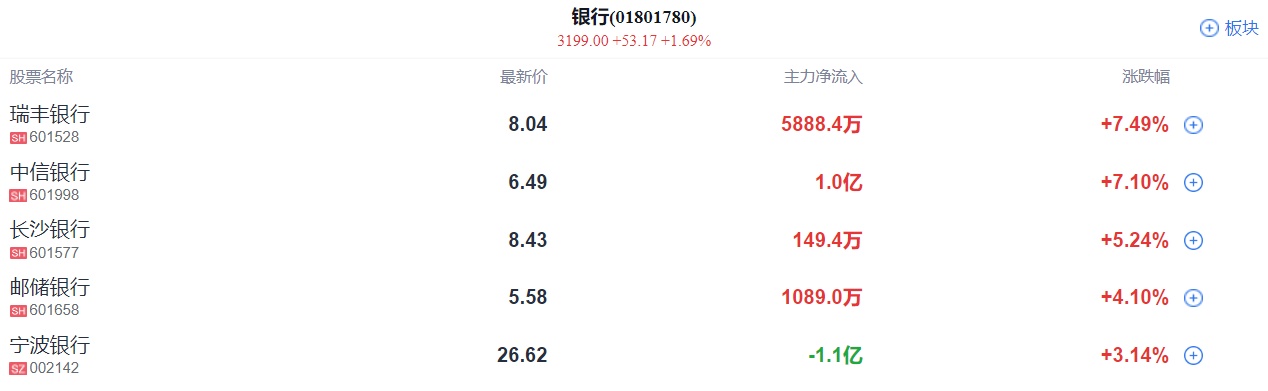 银行股震荡拉升,中信银行涨超7%,兰州银行、宁波银行、平安银行、无锡银行、杭州银行等跟涨。