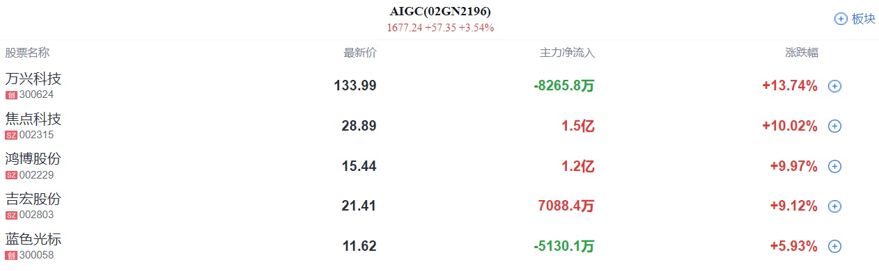 AIGC概念拉升,鸿博股份涨停,厦门信达、中文在线、同花顺、科大讯飞等跟涨。