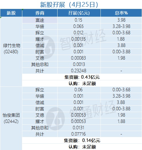 智通财经APP获悉,绿竹生物(02480)、怡俊集团(02442)正在招股中。截至4月25日,耀才、艾德等合计为绿竹生物借出孖展0.23248亿港元,认购未足额;合计为怡俊集团借出孖展近0.07716亿港元,认购未足额。
