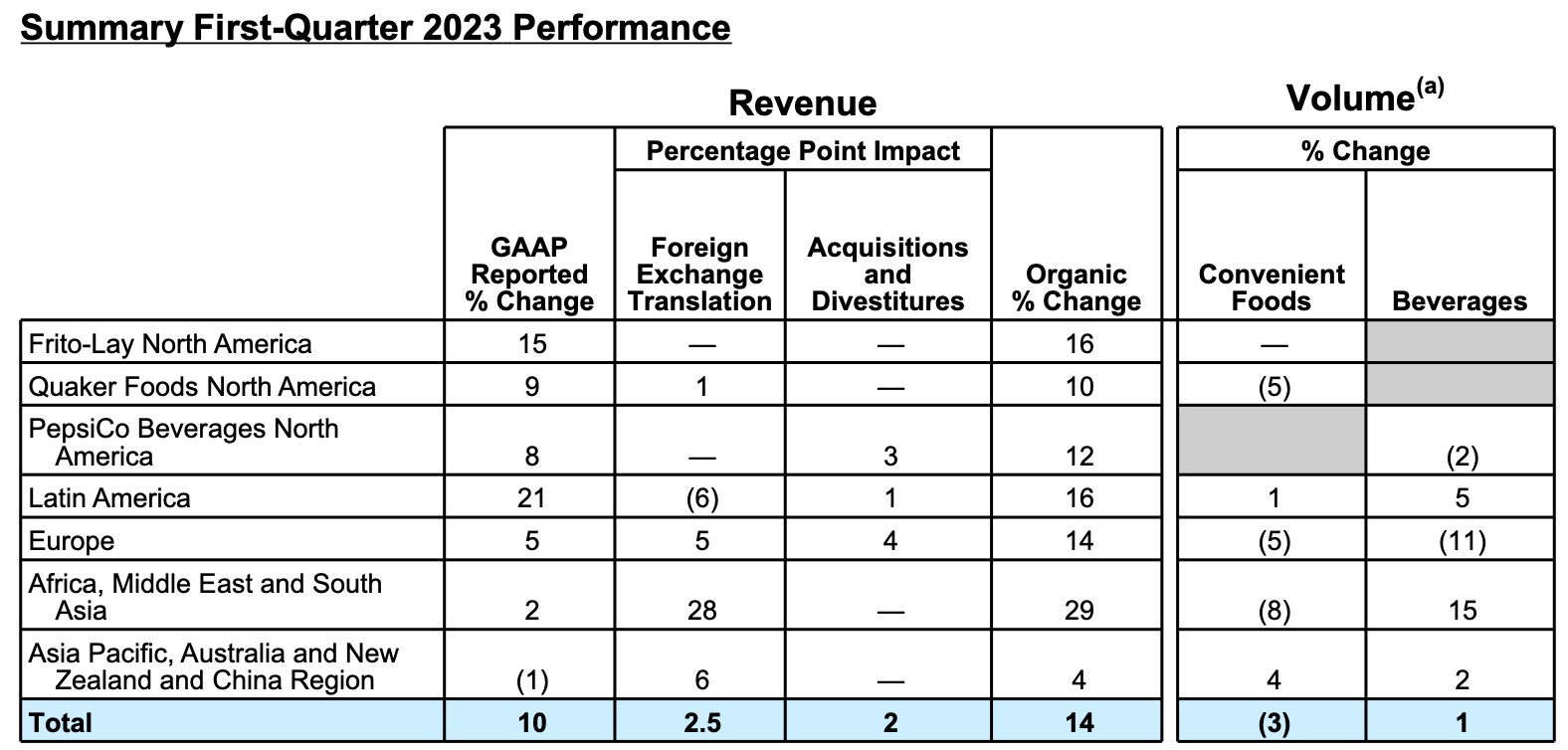 智通财经APP获悉,4月25日美股盘前,百事可乐(PEP.US)公布了2023年第一季度财务业绩。财报显示,百事可乐Q1净营收同比增长10.2%至178.46亿美元,好于市场预期的172亿美元;有机营收同比增长14.3%。核心每股收益(EPS)为1.50美元,好于市场预期的1.38美元,上年同期为1.29美元。
