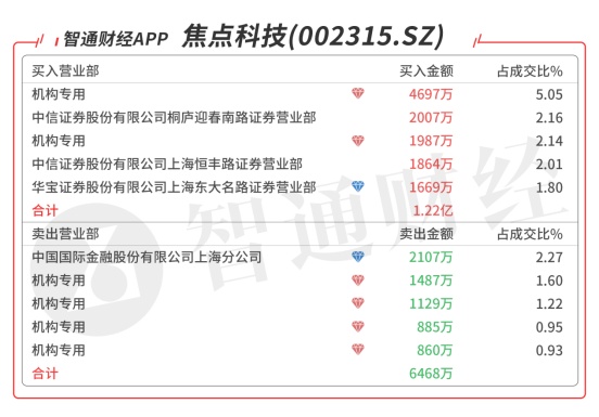 焦点科技(002315.SZ):受到众多机构青睐,今日共6个机构席位出现在龙虎榜单上,对倒合计净买入3636万元,买五是知名游资的席位买入1662万元,当日净买入7101万元,该股今日股价创新高,强势特征明显。