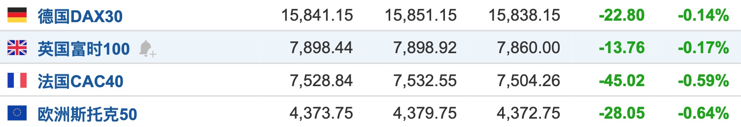 2.截至发稿,德国DAX指数跌0.14%,英国富时100指数跌0.17%,法国CAC40指数跌0.59%,欧洲斯托克50指数跌0.64%。