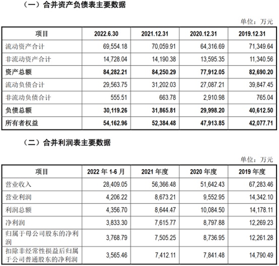 财务方面,于2019年度、2020年度及2021年度,公司实现营业收入分别约为6.73亿元、5.16亿元、5.64亿元。公司净利润分别约为1.23亿元、8797.88万元、7615.77万元人民币。