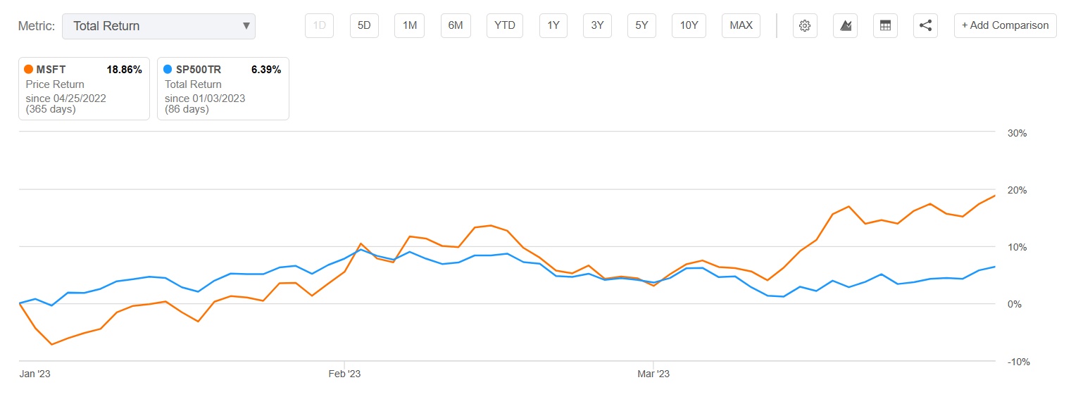 这份超预期的财报公布之后,该公司股价在纽约盘后交易中一度飙升超9%,超过300美元,此前该公司的收盘价为275.42美元,跌幅达2.25%。由于市场对微软新的人工智能计划和产品的乐观情绪不断升温,微软的股价在第一季度上涨约19%,而同期标普500指数仅上涨不到7%。
