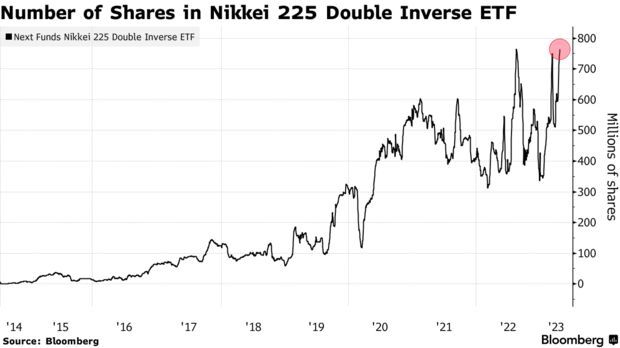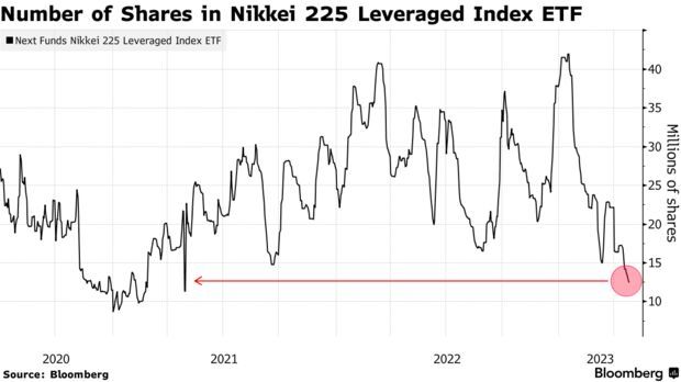 与此同时,日本国内的散户投资者正准备退出股市。受散户投资者欢迎的野村资产旗下Next Funds日经225杠杆指数ETF(Nikkei 225 Leveraged Index ETF)的股数已下降到2021年4月以来的最低水平,原因是散户投资者的撤资不断增加。
