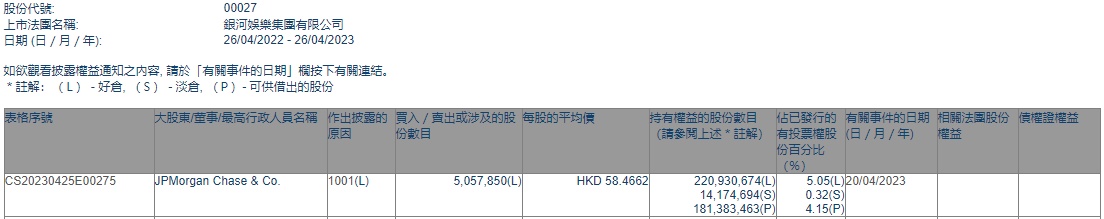 智通财经APP获悉,香港联交所最新资料显示,4月20日,小摩增持银河娱乐(00027)505.785万股,每股作价58.4662港元,总金额约为2.96亿港元。增持后最新持股数目约为2.21亿股,最新持股比例为5.05%。