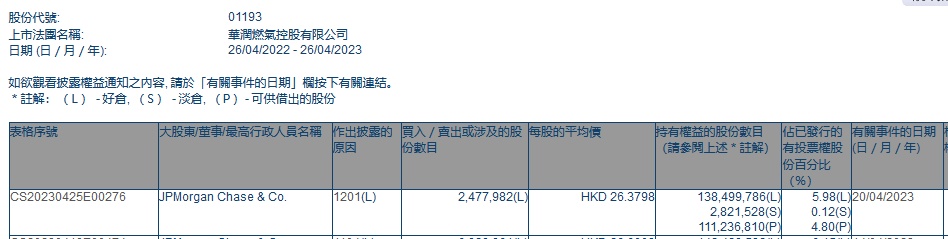 智通财经APP获悉,香港联交所最新资料显示,4月20日,小摩减持华润燃气(01193)247.7982万股,每股作价26.3798港元,总金额约为6536.87万港元。减持后最新持股数目约为1.38亿股,最新持股比例为5.98%。