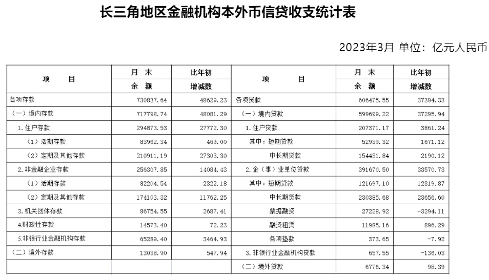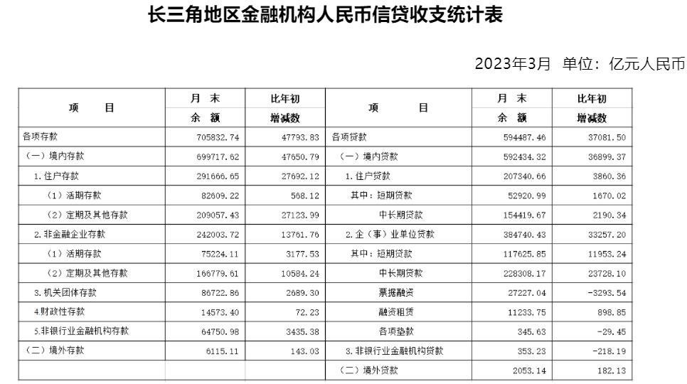 3月末,长三角地区本外币各项贷款余额60.65万亿元,同比增长14.1%;人民币贷款余额59.45万亿元,同比增长14.8%,增速比上月末高0.1个百分点。