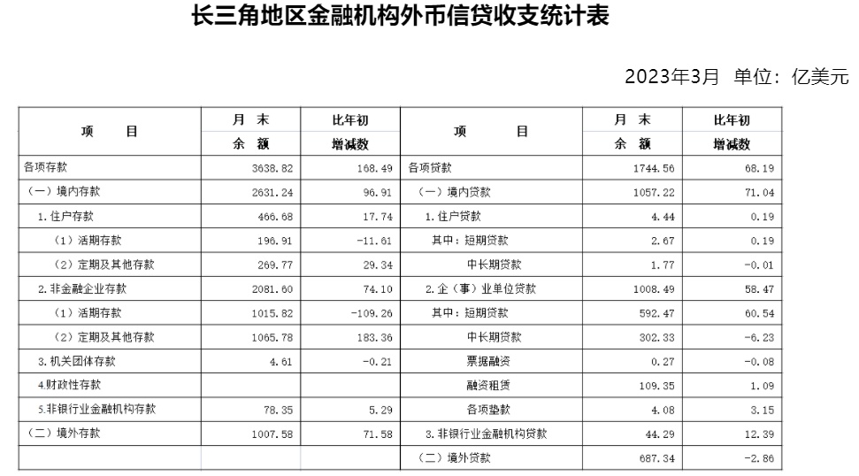 3月末,长三角地区外币贷款余额1745亿美元,同比下降17.2%。一季度外币贷款增加68亿美元,同比少增67亿美元。3月份外币贷款增加42亿美元,同比多增9亿美元。