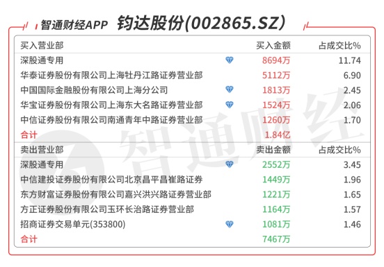 钧达股份(002865.SZ):多主力现身龙虎榜,深股通对倒买入6142万元,买二是知名游资新生代的席位买入4766万元,买三是量化基金的席位对倒买入1372万元,当日净买入1.05亿元,该股今日底部首板,预计有溢价。