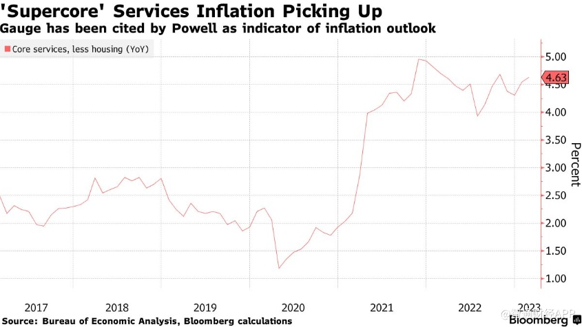 美联储主席鲍威尔和他的同事强调,在评估价格压力时,要关注不包括能源和住房在内的服务业通胀。市场预计,这一“超级核心”指标将在3月份加速,从而加大美联储下周再次加息25个基点的压力。