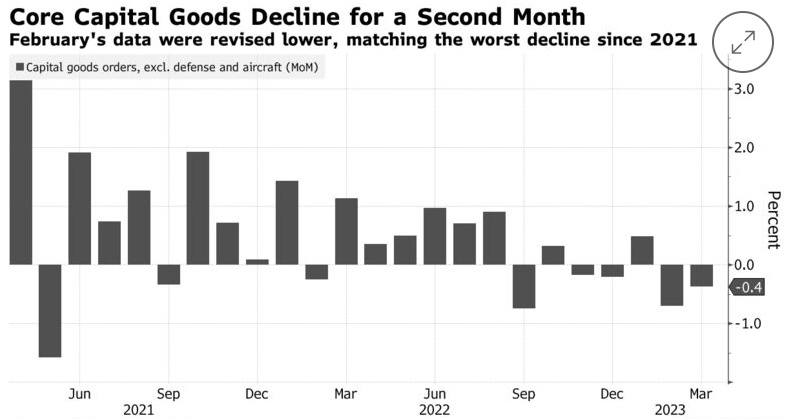 智通财经APP获悉,美国3月份企业设备订单下降幅度大于预期,表明借贷成本上升和经济前景不明朗正在抑制资本支出。美国商务部周三公布的数据显示,美国3月扣除飞机非国防资本品订单环比下降0.4%,预期为-0.1%。