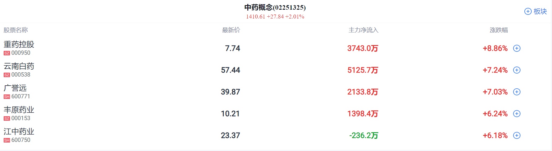 中药板块活跃,云南白药涨超5%,江中药业、广誉远、九芝堂、西藏药业等纷纷拉升。