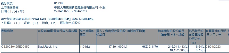 智通财经APP获悉,香港联交所最新资料显示,4月21日,贝莱德增持大唐新能源(01798)1739.1万股,每股作价3.1170港元,总金额约为5420.77万港元。增持后最新持股数目约为2.16亿股,最新持股比例为8.64%。