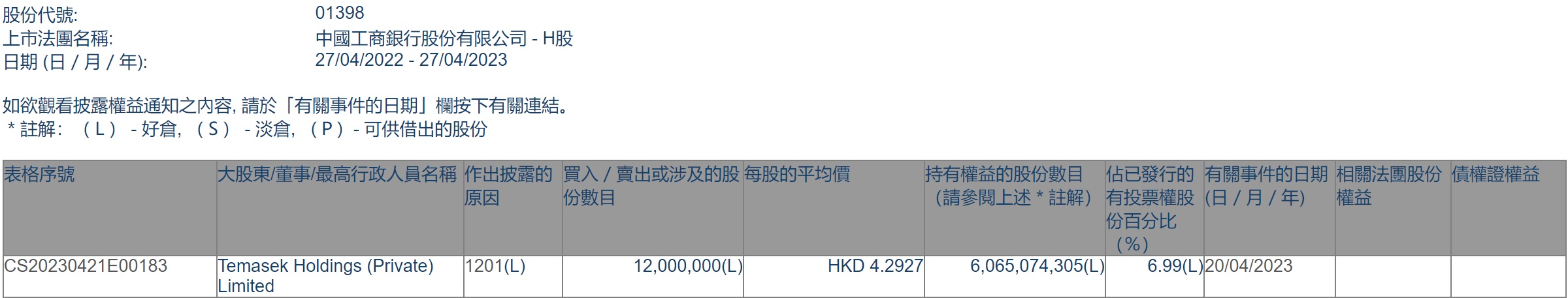 智通财经APP获悉,香港联交所最新资料显示,4月20日,Temasek Holdings (Private) Limited减持工商银行(01398)1200万股,每股作价4.2927港元,总金额为5151.24万港元。减持后最新持股数目约为60.65亿股,最新持股比例为6.99%。