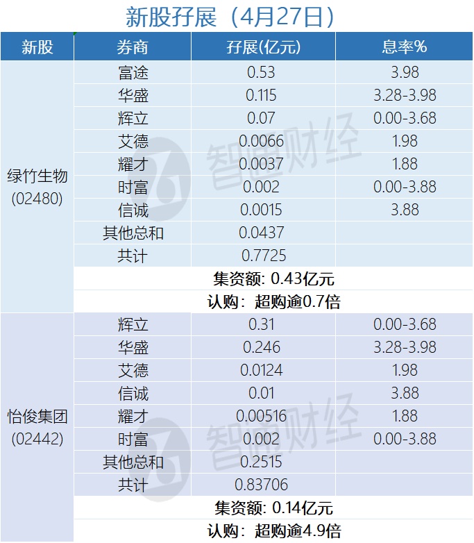 智通财经APP获悉,绿竹生物(02480)、怡俊集团(02442)正在招股中。截至4月27日,耀才、艾德等合计为绿竹生物借出孖展0.7725亿港元,超购逾0.7倍;合计为怡俊集团借出孖展近0.83706亿港元,超购逾4.9倍。