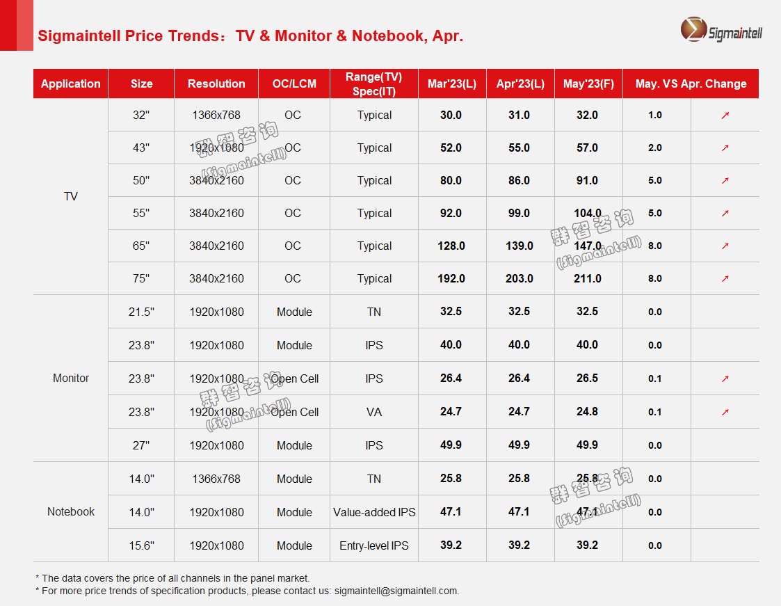 23.8"FHD,4月VA OC低价有望迎来小幅上涨,均价相对稳定, 5月预估上涨0.1$; IPS OC 4月均保持稳定,5月受低价上涨带动均价小幅上涨;IPS模组价格持平。