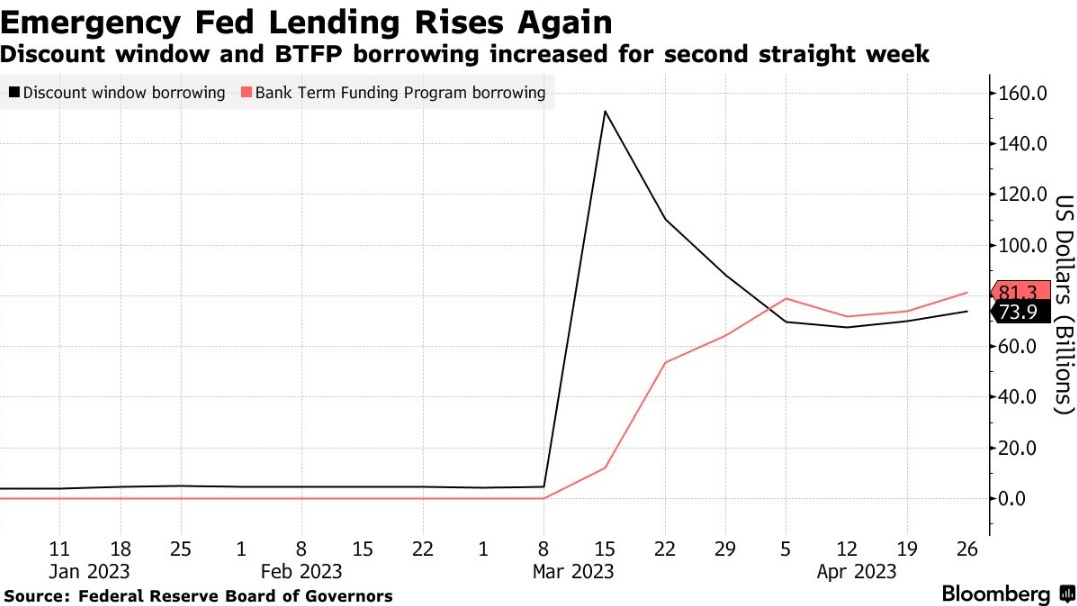 智通财经APP获悉,美国的银行连续第二周增加从美联储获得的紧急借款,这突显出在上月一系列银行倒闭后,金融体系面临的持续压力。根据周四公布的数据,在截至4月26日的一周内,美联储通过两项支持贷款机制向金融机构提供了1552亿美元的未偿贷款,而上周为1439亿美元。