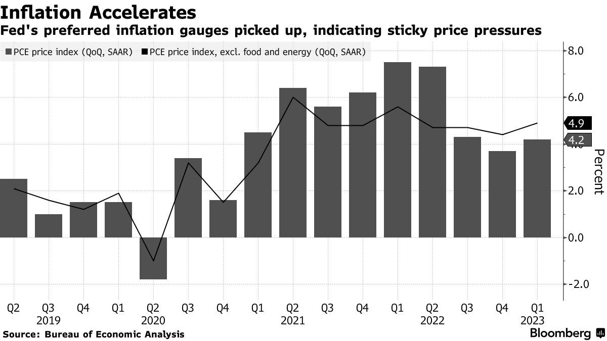 令美联储的官员们感到沮丧的是,美联储最青睐的核心PCE指标(不包括食品和能源)——在1-3月期间的第一季度环比上涨了4.9%,这是一年来最快的增速,且高于经济学家普遍预期的4.7%。与此同时,另一份报告显示就业市场持续强劲,上周初请失业金人数意外下降,使得经济学家对于美国劳动力市场降温,以及薪资涨幅放缓的这一预期趋于弱化。