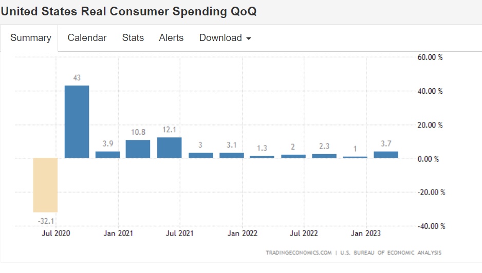 消费者支出经年化调整后的季度增幅为3.7%,反映出商品和服务的消费增长,其中包括汽车购买量激增。