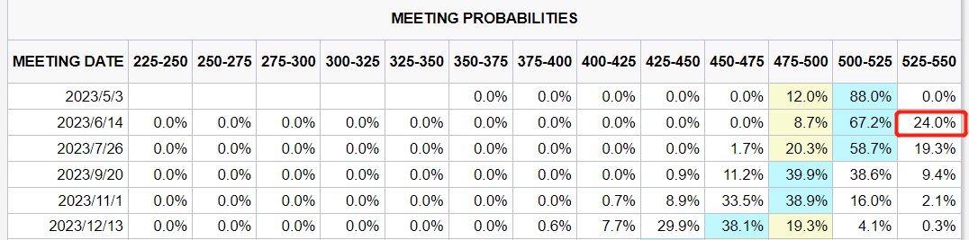 “CME美联储观察工具”显示,多数利率期货交易员们押注美联储下周将坚持加息25个基点,该工具显示美联储下周加息25个基点的概率接近90%,远高于上周的79%,同时押注6月加息25个基点的概率也在不断上升。