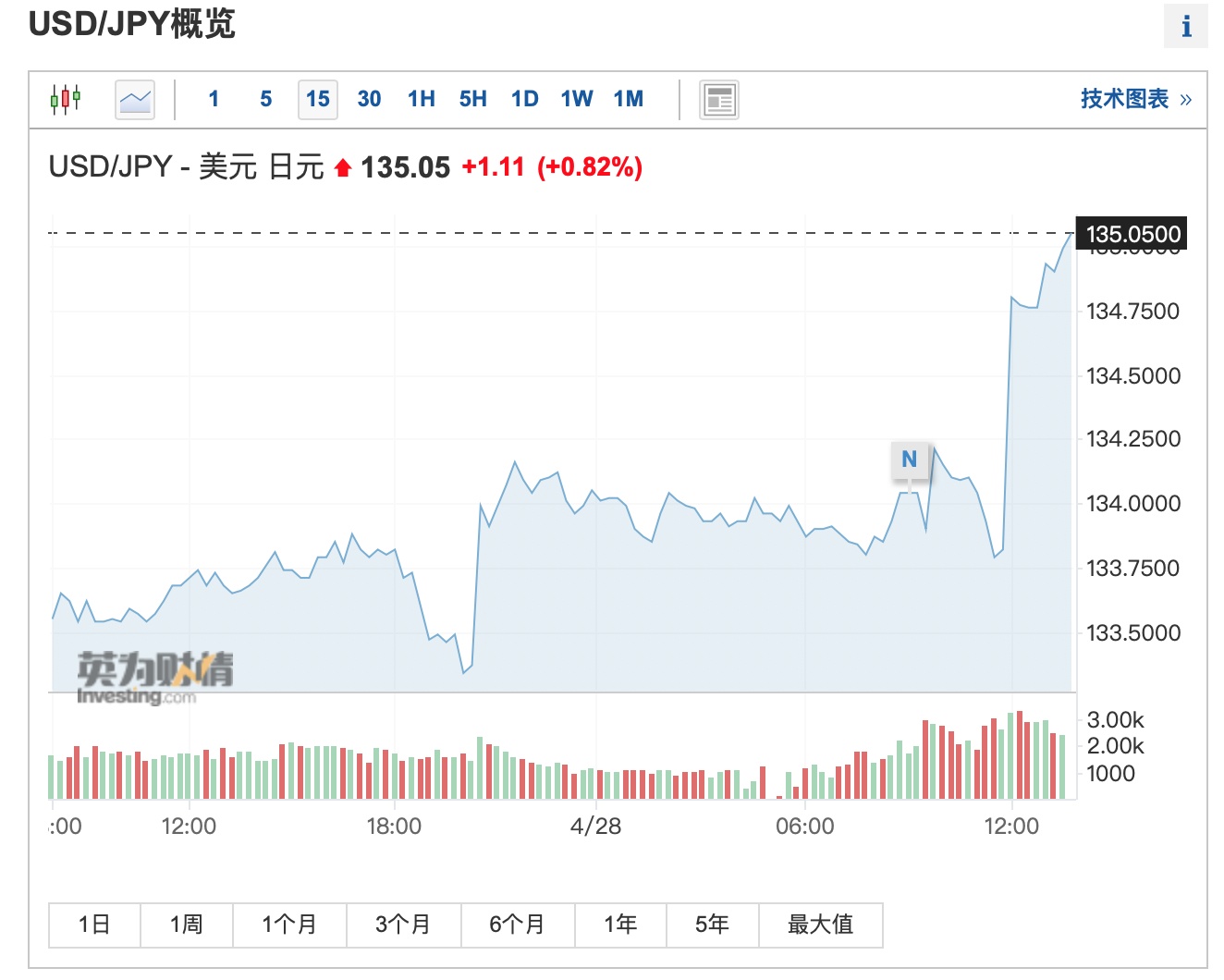 智通财经APP获悉,日本央行周五公布了在新任行长植田和男领导下的首次利率决议。日本央行维持收益率曲线控制(YCC)政策不变,符合市场预期。日本央行将基准利率维持在历史低点-0.1%,并维持十年期日债收益率目标区间上限为0.5%。受此消息影响,截至发稿,美元兑日元汇率涨0.82%,重新升至135上方。