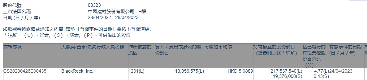 智通财经APP获悉,香港联交所最新资料显示,4月24日,贝莱德减持中国建材(03323)1305.6575万股,每股作价5.9889港元,总金额约为7819.45万港元。减持后最新持股数目约为2.18亿股,最新持股比例为4.77%。