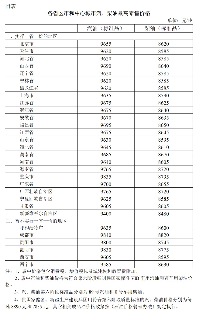 智通财经APP获悉,4月28日,国家发改委官网显示,根据近期国际市场油价变化情况,按照现行成品油价格形成机制,自2023年4月28日24时起,国内汽、柴油价格(标准品,下同)每吨分别降低160元和155元。调整后,各省(区、市)和中心城市汽、柴油最高零售价格见附表。相关价格联动及补贴政策按现行规定执行。