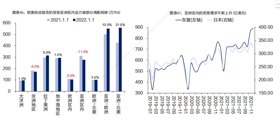 供给方面,受到欧美供应链危机造成的运力虹吸效应的影响,部分区内运力被调运到欧线、美线市场,市场供给端的持续收缩。