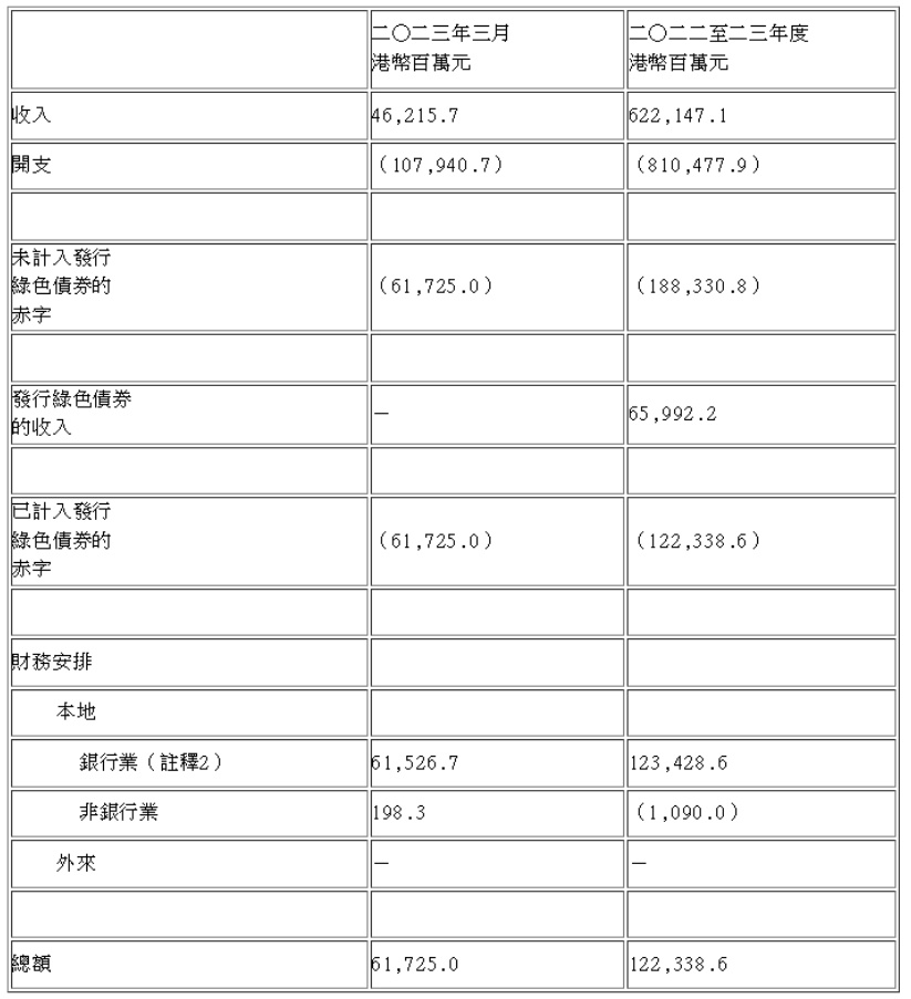 智通财经APP获悉,4月28日,香港特区政府公布2022至2023年度财务状况的临时数字。2022至2023年度的整体开支为8,105亿港元,收入为6,222亿港元。计入在政府绿色债券计划下发行的绿色债券(绿色债券)所得660亿港元收入后,本财政年度录得1,223亿港元赤字。临时数字跟原来预算的差异,在开支方面增加了0.4%(32亿港元),而收入方面减少了13.1%(937亿港元)。