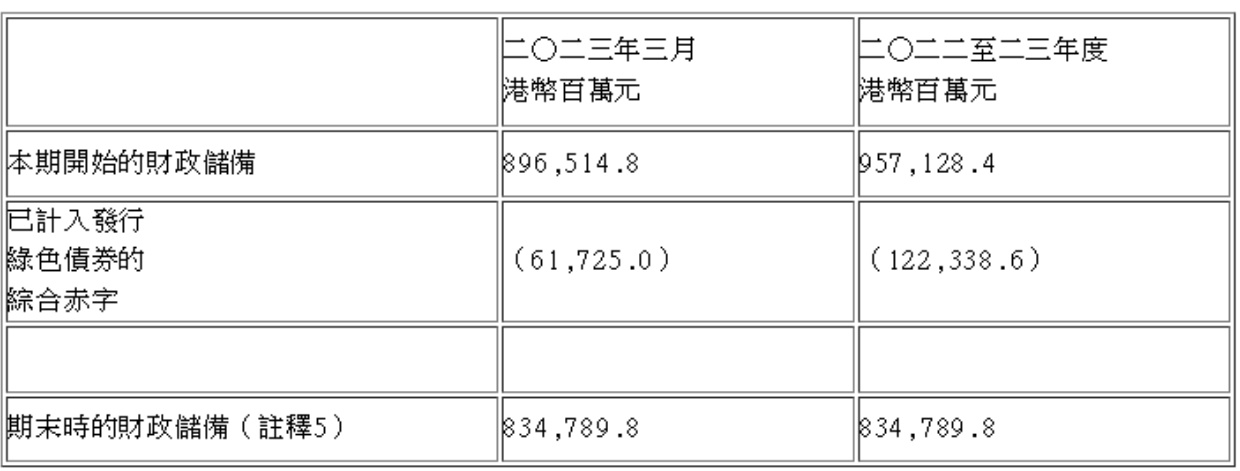本年度综合赤字较修订预算(1,398亿港元赤字)减少了175亿港元。其中收入比预测增加184亿港元(3%),主要由于入息及利得税(增加了163亿港元)和印花税(增加了30亿港元)的收入比预期高。另一方面,开支较修订预算增加了9亿港元(0.1%),主要由于开支需要较预期高。财政储备在2023年3月31日为8,348亿港元。