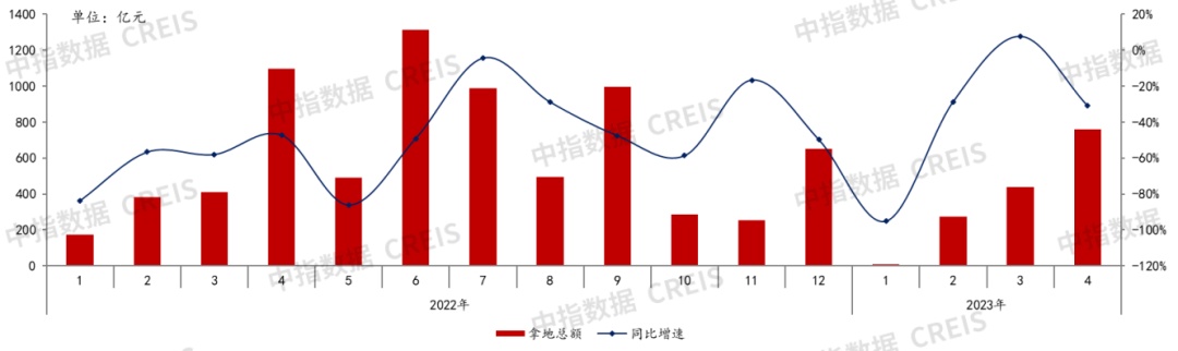 智通财经APP获悉,4月28日,中指研究院发布2023年1-4月全国房地产企业拿地TOP100排行榜。数据显示,2023年1-4月,TOP100企业拿地总额3150.1亿元,拿地规模同比下降13.1%,降幅较上月收窄1.88个百分点,降幅继续收窄。2023年4月,50家代表房企拿地总额同比下降30.8%,环比增长72.5%。具体来看,50家代表企业内部分化显著,头部规模的央国企拿地金额及面积显著多于中等规模企业,如华润置地、建发房产、万科等,4月拿地均有所参与。