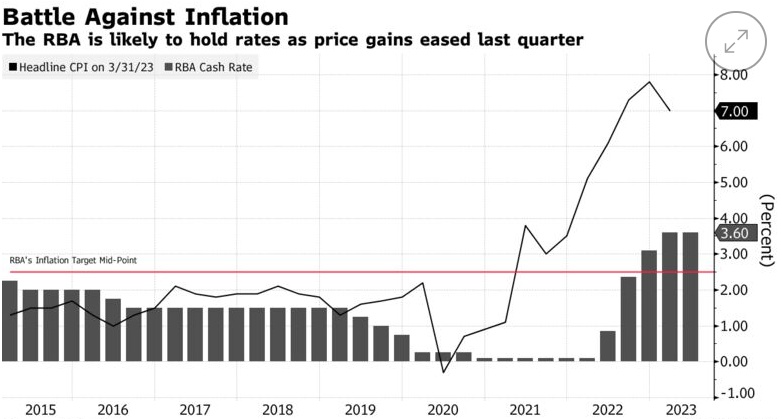 多数经济学家预测和货币市场定价显示,澳洲联储将连续第二个月将现金利率维持在3.6%的水平。在第一季度核心通胀低于预期后,德意志银行和西太平洋银行等公司的预测从继续加息转为维持利率不变。澳大利亚联邦银行则坚持其加息25个基点的预期。