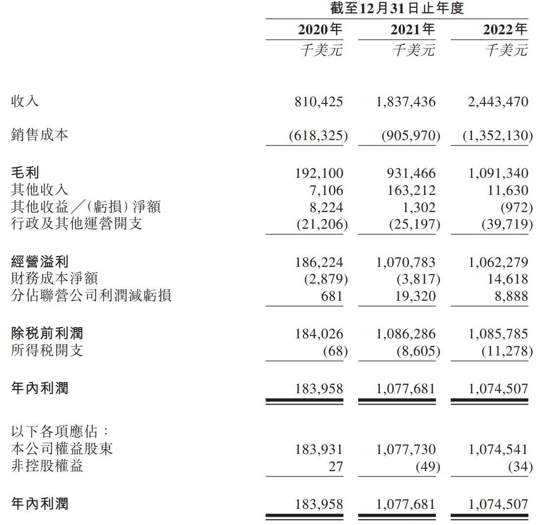截至2020年、2021年及2022年12月31日止年度,公司录得纯利分别约为1.84亿美元、10.78亿美元及10.75亿美元。