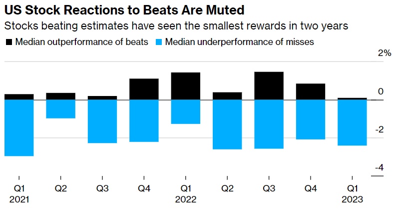 富国银行证券团队的一项分析显示,利润超过预期的标普500指数公司的表现仅比该指数高出10个基点,而2022年的平均水平为73个基点。他们的数据显示,业绩超预期的标普500指数成分股与该指数的股价表现也在缩小,本季有53%的成分股跑赢该指数,而去年这一比例平均为58%。