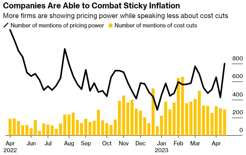 媒体汇编的数据显示,业绩报道中提到定价权的次数越来越多,而削减成本的次数却在减少。百事可乐(PEP.US)等公司预计需求将保持强劲,而花旗集团的一项指数显示,下调收益预期的速度开始放缓。