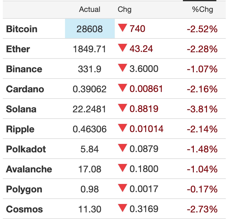 智通财经APP获悉,在经历了连续四个月上涨之后,比特币在五月的第一天走弱。截至发稿,比特币跌2.52%,报28608美元/枚。第二大加密货币以太坊也跌超2%,报约1850美元/枚。