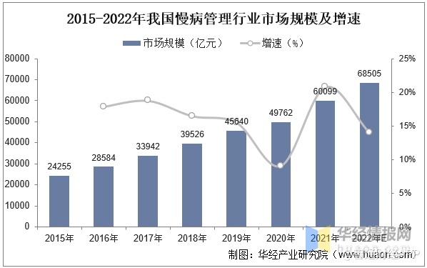 据华经产业研究院整理数据,按商品交易总额计,我国慢病管理市场的整体规模由2015年的24255亿元快速增长至2021年的60099亿元,CAGR为16.3%,并预计2022年达到68505亿元。