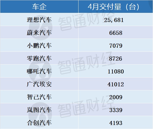 智通财经APP获悉,5月1日,多家新能源车企公布了2023年4月新车交付成绩单。从各家造车新势力4月的交付情况来看,理想汽车、哪吒汽车和广汽埃安4月的交付量均超过1万辆。其中,理想汽车(02015)表现颇为“理想”,4月共交付新车25681辆,同比增长516.3%。