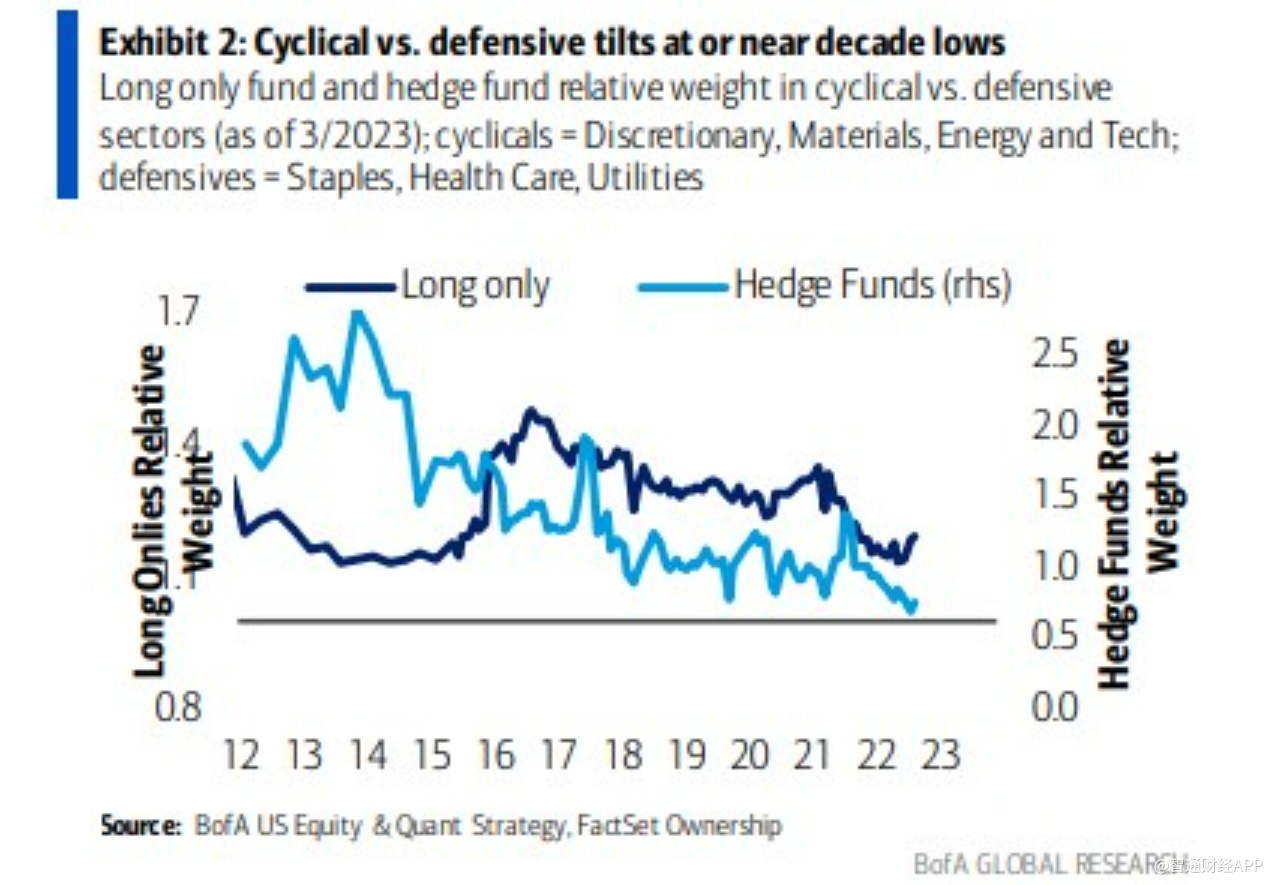 美国银行汇编的数据显示,同时做多和做空的对冲基金已将其周期性股票与防御性股票的比例降至至少2012年以来的最低水平。对于只做多的基金经理来说,他们对周期性公司(这些公司的命运取决于商业周期的起伏)的相对敞口接近2008年以来的最低水平。